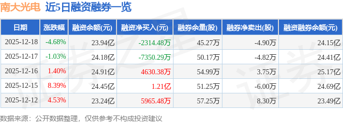 证券之星消息,截至2025年12月18日收盘,南大光电(300346)报收于45.01元,下跌4.68%,换手率11.0%,成交量72.19万手,成交额33.29亿元。
