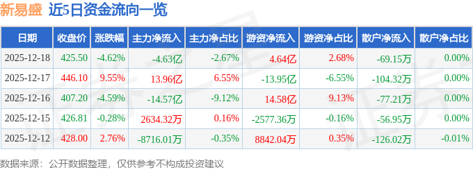 证券之星消息,截至2025年12月18日收盘,新易盛(300502)报收于425.5元,下跌4.62%,换手率4.52%,成交量40.04万手,成交额173.25亿元。