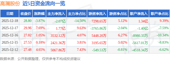 证券之星消息,截至2025年12月18日收盘,高澜股份(300499)报收于28.8元,下跌3.87%,换手率17.79%,成交量48.27万手,成交额14.27亿元。