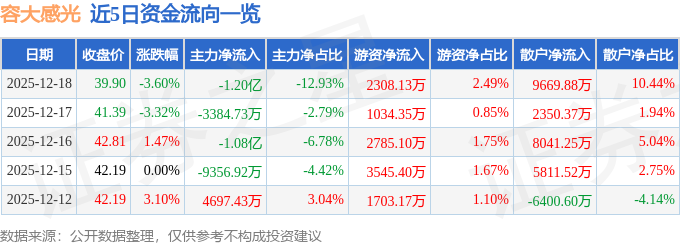 证券之星消息,截至2025年12月18日收盘,容大感光(300576)报收于39.9元,下跌3.6%,换手率9.82%,成交量22.84万手,成交额9.27亿元。