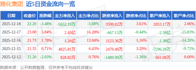 证券之星消息,截至2025年12月18日收盘,雅化集团(002497)报收于22.2元,下跌3.48%,换手率4.15%,成交量43.93万手,成交额9.96亿元。