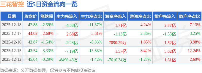 证券之星消息,截至2025年12月18日收盘,三花智控(002050)报收于42.88元,下跌2.59%,换手率2.52%,成交量92.82万手,成交额40.28亿元。