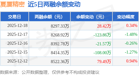 证券之星消息,12月18日,夏厦精密(001306)融资买入465.9万元,融资偿还438.02万元,融资净买入27.88万元,融资余额8272.29万元,近20个交易日中有11个交易日出现融资净买入。