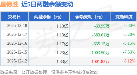 证券之星消息,12月18日,星德胜(603344)融资买入1328.08万元,融资偿还1357.61万元,融资净卖出29.52万元,融资余额1.13亿元。
