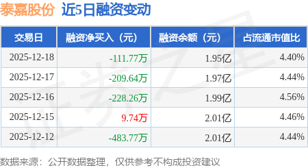 证券之星消息,12月18日,泰嘉股份(002843)融资买入480.05万元,融资偿还591.82万元,融资净卖出111.77万元,融资余额1.95亿元。