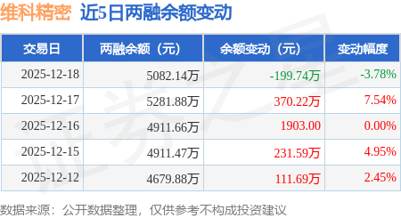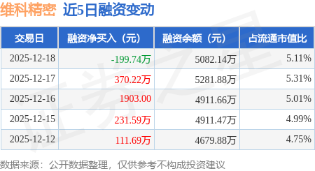 证券之星消息,12月18日,维科精密(301499)融资买入482.11万元,融资偿还681.85万元,融资净卖出199.74万元,融资余额5082.14万元。