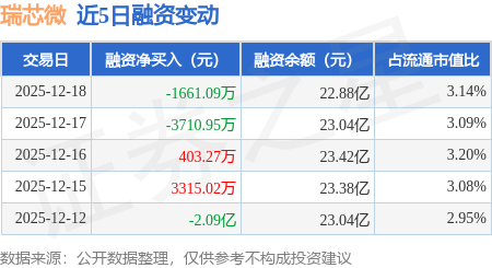 证券之星消息,12月18日,瑞芯微(603893)融资买入9569.42万元,融资偿还1.12亿元,融资净卖出1661.09万元,融资余额22.88亿元,近20个交易日中有11个交易日出现融资净买入。
