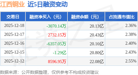 证券之星消息,12月18日,江西铜业(600362)融资买入1.67亿元,融资偿还1.97亿元,融资净卖出3070.14万元,融资余额20.13亿元,近20个交易日中有11个交易日出现融资净买入。