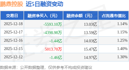 证券之星消息,12月18日,鹏鼎控股(002938)融资买入9631.09万元,融资偿还1.52亿元,融资净卖出5593.1万元,融资余额13.03亿元。