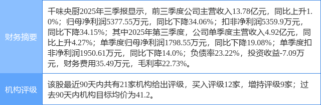今日千味央厨(001215)涨5.34%,收盘报41.4元。