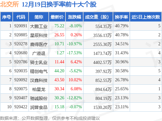 当日北交所换手率前10大个股中4只个股收涨,平均涨幅5.7%,其中大鹏工业(920091)以换手率40.79%排第一,9只个股近5个交易日中多次上榜。