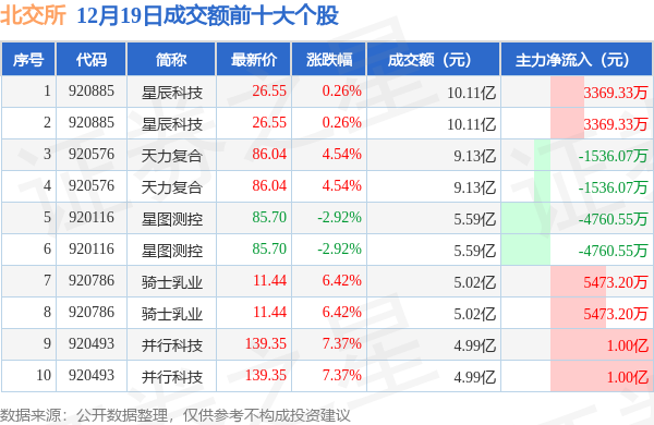 当日北交所成交额前10大个股中8只个股收涨,平均涨幅4.65%,其中星辰科技(920885)以成交额10.11亿元排第一。从主力资金流入看,成交额前10大个股中有6只个股呈现主力资金净流入。
