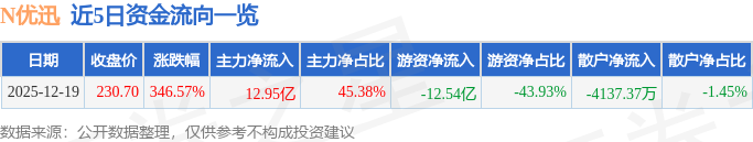 证券之星消息,截至2025年12月19日收盘,N优迅(688807)报收于230.7元,上涨346.57%,换手率78.74%,成交量11.84万手,成交额28.54亿元。