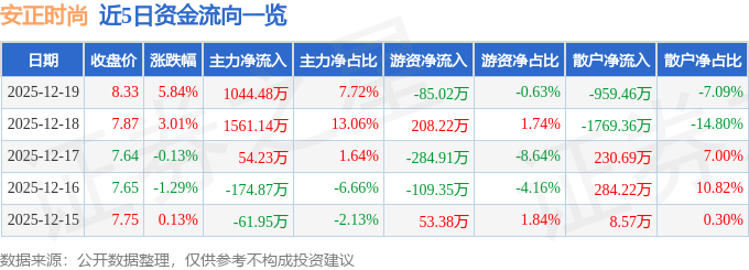 证券之星消息,截至2025年12月19日收盘,安正时尚(603839)报收于8.33元,上涨5.84%,换手率4.22%,成交量16.43万手,成交额1.35亿元。