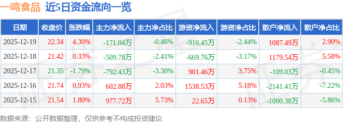 证券之星消息,截至2025年12月19日收盘,一鸣食品(605179)报收于22.34元,上涨4.3%,换手率4.27%,成交量17.13万手,成交额3.75亿元。