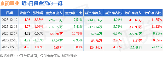 证券之星消息,截至2025年12月19日收盘,京能置业(600791)报收于4.93元,上涨3.35%,换手率1.62%,成交量7.31万手,成交额3554.94万元。
