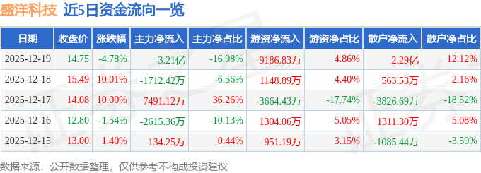 证券之星消息,截至2025年12月19日收盘,盛洋科技(603703)报收于14.75元,下跌4.78%,换手率29.04%,成交量120.52万手,成交额18.91亿元。