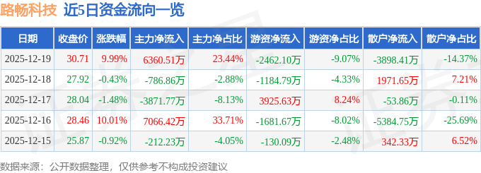 证券之星消息,截至2025年12月19日收盘,路畅科技(002813)报收于30.71元,上涨9.99%,涨停,换手率7.59%,成交量9.1万手,成交额2.71亿元。