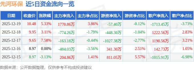 证券之星消息,截至2025年12月19日收盘,先河环保(300137)报收于10.48元,上涨5.33%,换手率8.44%,成交量44.73万手,成交额4.59亿元。