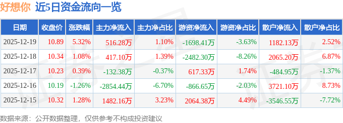 证券之星消息,截至2025年12月19日收盘,好想你(002582)报收于10.89元,上涨5.32%,换手率12.68%,成交量43.65万手,成交额4.68亿元。