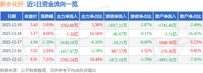 证券之星消息,截至2025年12月19日收盘,新乡化纤(000949)报收于5.43元,上涨5.03%,换手率7.72%,成交量131.28万手,成交额7.02亿元。