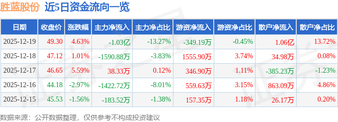 证券之星消息,截至2025年12月19日收盘,胜蓝股份(300843)报收于49.3元,上涨4.63%,换手率9.79%,成交量15.38万手,成交额7.76亿元。