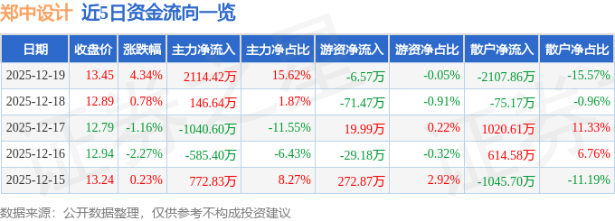 证券之星消息,截至2025年12月19日收盘,郑中设计(002811)报收于13.45元,上涨4.34%,换手率3.6%,成交量10.18万手,成交额1.35亿元。