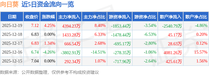 证券之星消息,截至2025年12月19日收盘,向日葵(300111)报收于7.12元,上涨4.25%,换手率5.75%,成交量74.05万手,成交额5.23亿元。