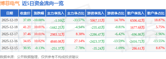 证券之星消息,截至2025年12月19日收盘,博菲电气(001255)报收于37.09元,下跌10.0%,跌停,换手率12.93%,成交量9.19万手,成交额3.45亿元。