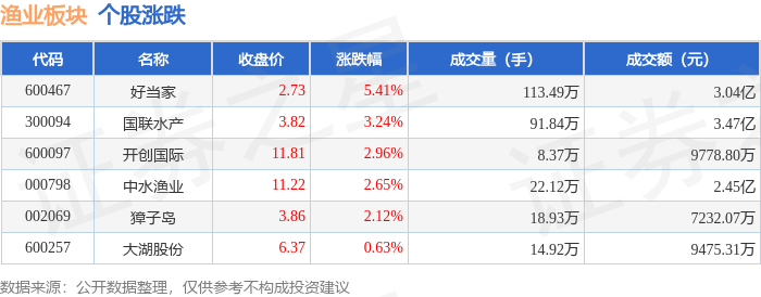 证券之星消息,12月19日渔业板块较上一交易日上涨2.95%,好当家领涨。当日上证指数报收于3890.45,上涨0.36%。深证成指报收于13140.22,上涨0.66%。渔业板块个股涨跌见下表: