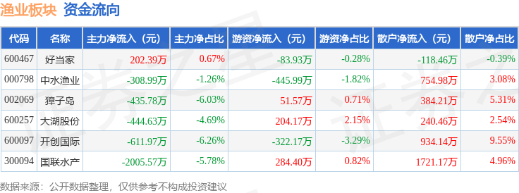 从资金流向上来看,当日渔业板块主力资金净流出3604.54万元,游资资金净流出311.95万元,散户资金净流入3916.49万元。渔业板块个股资金流向见下表: