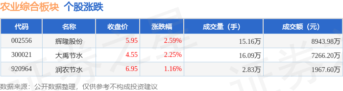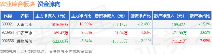 从资金流向上来看,当日农业综合板块主力资金净流入493.89万元,游资资金净流出1095.68万元,散户资金净流入601.79万元。农业综合板块个股资金流向见下表: