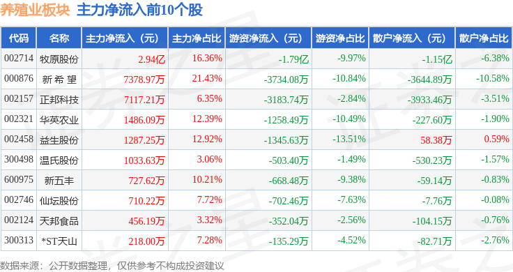 从资金流向上来看,当日养殖业板块主力资金净流入3.89亿元,游资资金净流出2.94亿元,散户资金净流出9471.4万元。养殖业板块个股资金流向见下表: