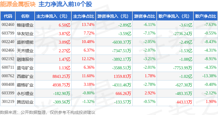 从资金流向上来看,当日能源金属板块主力资金净流入19.05亿元,游资资金净流出8.4亿元,散户资金净流出10.65亿元。能源金属板块个股资金流向见下表: