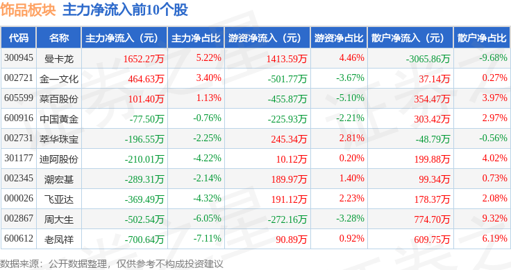 从资金流向上来看,当日饰品板块主力资金净流出1.12亿元,游资资金净流入3265.04万元,散户资金净流入7902.12万元。饰品板块个股资金流向见下表: