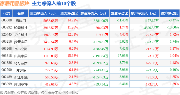 从资金流向上来看,当日家居用品板块主力资金净流出1.34亿元,游资资金净流出1.51亿元,散户资金净流入2.85亿元。家居用品板块个股资金流向见下表: