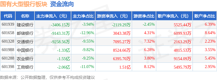 从资金流向上来看,当日国有大型银行板块主力资金净流出7.13亿元,游资资金净流入3.81亿元,散户资金净流入3.33亿元。国有大型银行板块个股资金流向见下表: