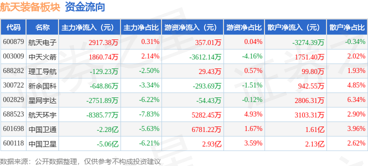 从资金流向上来看,当日航天装备板块主力资金净流出8.06亿元,游资资金净流入3.78亿元,散户资金净流入4.28亿元。航天装备板块个股资金流向见下表: