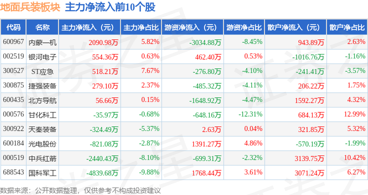 从资金流向上来看,当日地面兵装板块主力资金净流出2.66亿元,游资资金净流入549.53万元,散户资金净流入2.6亿元。地面兵装板块个股资金流向见下表: