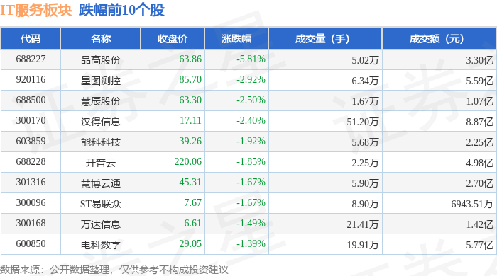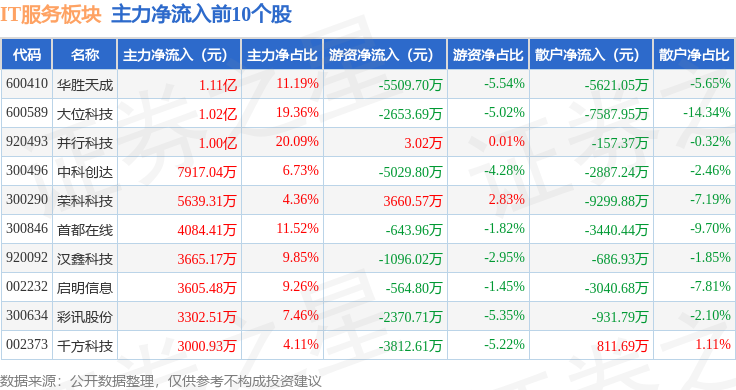 从资金流向上来看,当日IT服务板块主力资金净流出5.22亿元,游资资金净流出2.95亿元,散户资金净流入8.17亿元。IT服务板块个股资金流向见下表:
