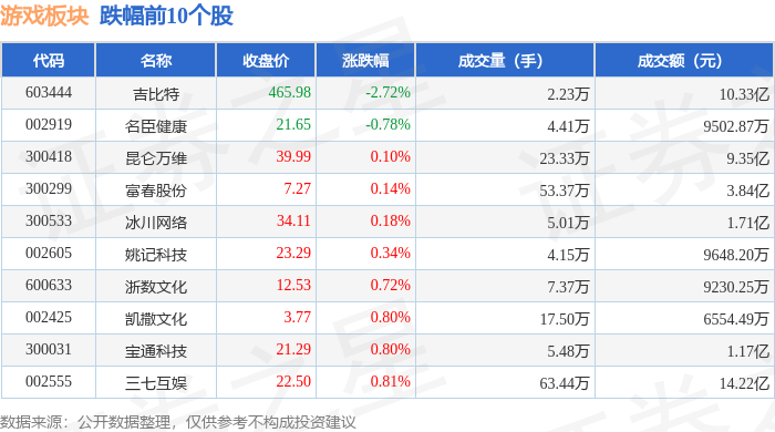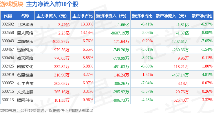 从资金流向上来看,当日游戏板块主力资金净流入3.04亿元,游资资金净流出3.22亿元,散户资金净流入1823.83万元。游戏板块个股资金流向见下表: