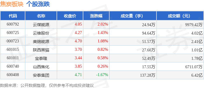 证券之星消息,12月19日焦炭板块较上一交易日上涨0.73%,云煤能源领涨。当日上证指数报收于3890.45,上涨0.36%。深证成指报收于13140.22,上涨0.66%。焦炭板块个股涨跌见下表: