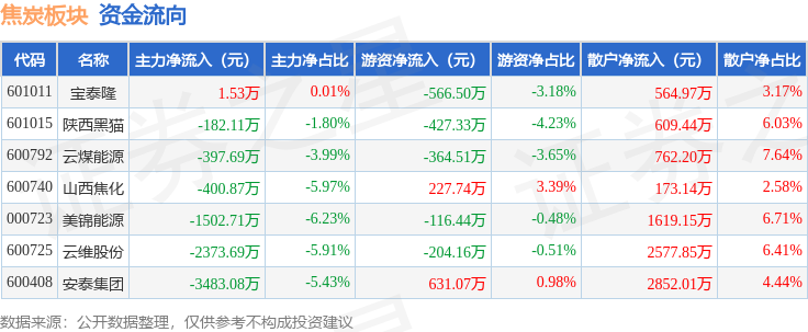 从资金流向上来看,当日焦炭板块主力资金净流出8338.62万元,游资资金净流出820.13万元,散户资金净流入9158.75万元。焦炭板块个股资金流向见下表: