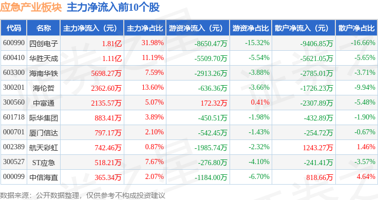 从资金流向上来看,当日应急产业板块主力资金净流出5405.42万元,游资资金净流出2.35亿元,散户资金净流入2.89亿元。应急产业板块个股资金流向见下表: