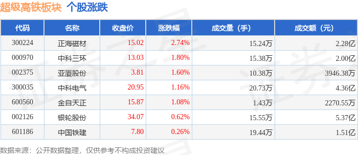 证券之星消息,12月19日超级高铁板块较上一交易日上涨0.79%,正海磁材领涨。当日上证指数报收于3890.45,上涨0.36%。深证成指报收于13140.22,上涨0.66%。超级高铁板块个股涨跌见下表: