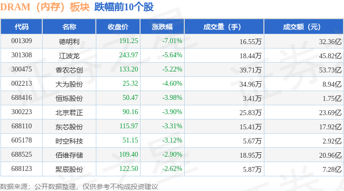 证券之星消息,12月19日DRAM(内存)板块较上一交易日下跌1.67%,德明利领跌。当日上证指数报收于3890.45,上涨0.36%。深证成指报收于13140.22,上涨0.66%。DRAM(内存)板块个股涨跌见下表: