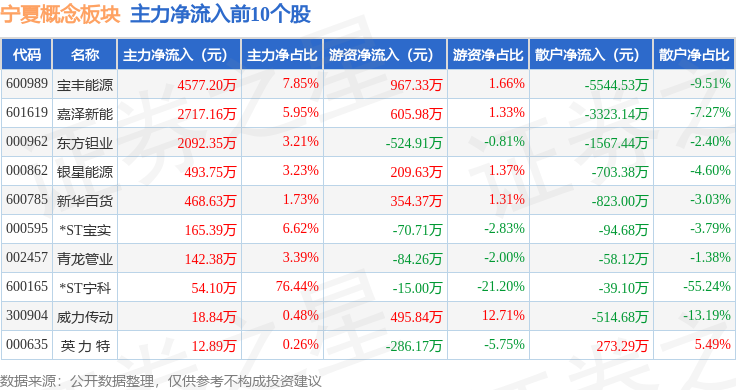 从资金流向上来看,当日宁夏概念板块主力资金净流入9145.28万元,游资资金净流入1329.71万元,散户资金净流出1.05亿元。宁夏概念板块个股资金流向见下表:
