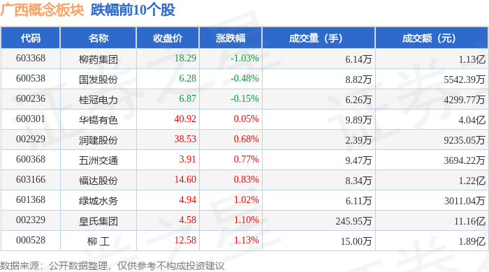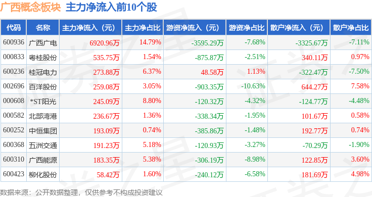 从资金流向上来看,当日广西概念板块主力资金净流出1.42亿元,游资资金净流出1015.06万元,散户资金净流入1.52亿元。广西概念板块个股资金流向见下表: