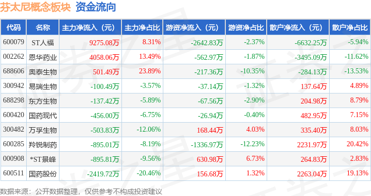 从资金流向上来看,当日芬太尼概念板块主力资金净流入8426.35万元,游资资金净流出3935.68万元,散户资金净流出4490.68万元。芬太尼概念板块个股资金流向见下表:
