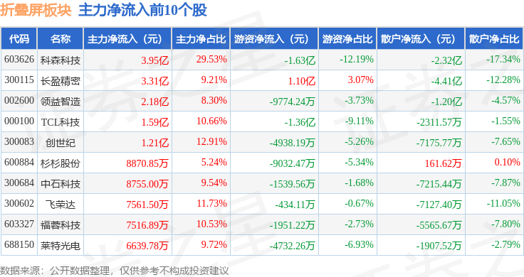 从资金流向上来看,当日折叠屏板块主力资金净流入13.67亿元,游资资金净流出5.86亿元,散户资金净流出7.8亿元。折叠屏板块个股资金流向见下表: